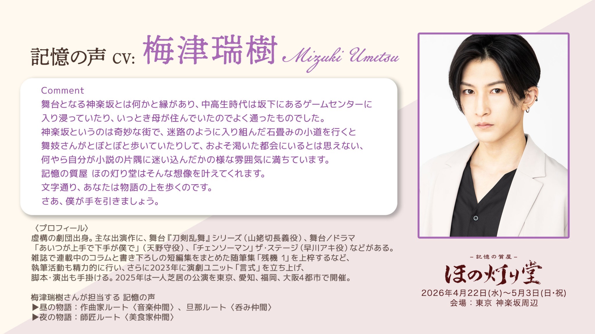 本公演では新たに、「Locatone™(ロケトーン)」から流れる記憶の声として、俳優の梅津瑞樹さん、声優の寺崎裕香さんの出演が決定しました。