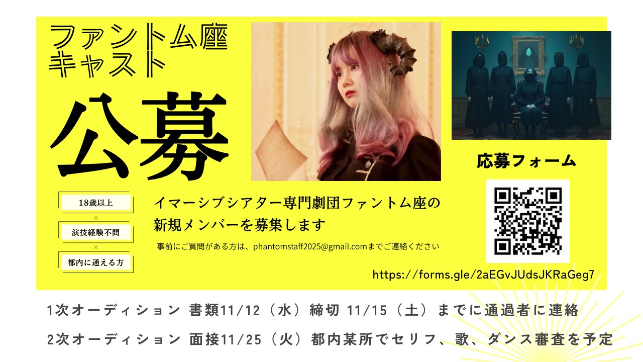 旗揚げ公演『ハロウィンイマーシブシアター魔女たちの奇妙な晩餐会』を終えたばかりのファントム座では、今仲間を募集しています。